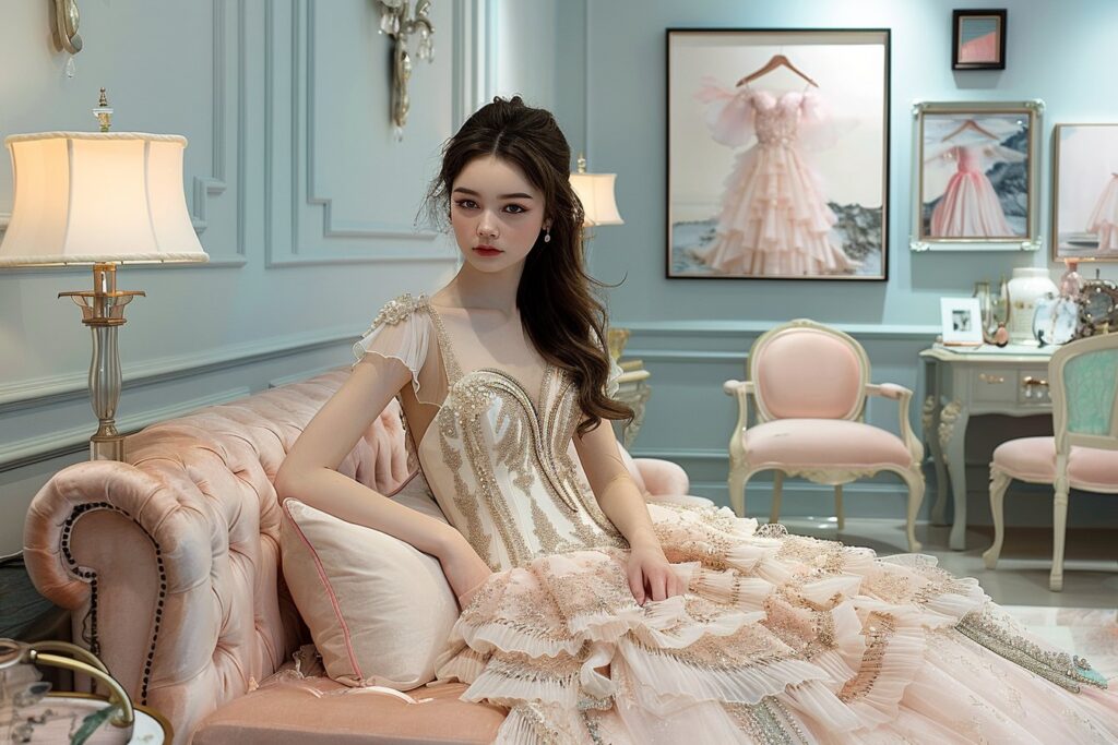 Les broderies délicates sur votre robe peuvent se retrouver subtilement dans vos choix de tissus pour les nappes, serviettes, et rideaux. Cela apporte une texture qui contraste joliment avec les surfaces plus lisses. Optez pour des tissus raffinés tels que la soie ou le satin, ornés de motifs brodés similaires à ceux de votre robe.