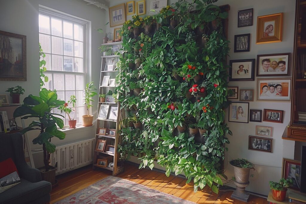 Avec un mur trop haut, pourquoi ne pas jouer avec des éléments naturels ? Installer un jardin vertical peut apporter de la vie et de la couleur à votre pièce :