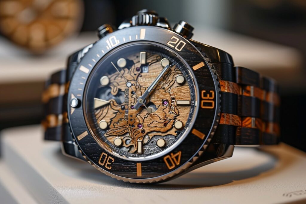 Un bel exemple serait une montre en bois dont le cadran intègre des motifs géométriques en cuivre martelé, assortis à un bracelet en cuir finement travaillé. Ce type de fusion offre un contraste saisissant qui capte immédiatement l’attention tout en rendant hommage aux grandes périodes artistiques du passé.